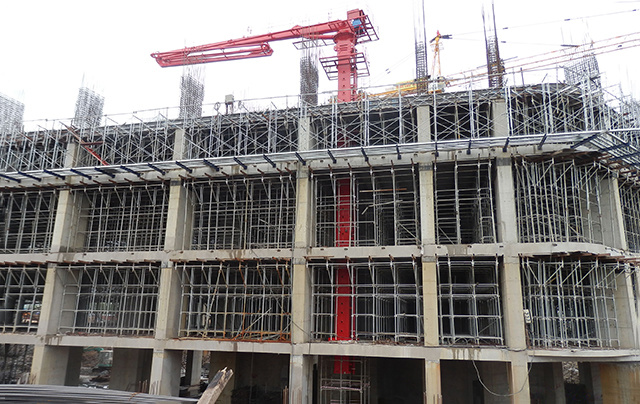 配置自動爬升系統(tǒng),在電梯井道內(nèi)或樓板上自動頂升,使布料機隨著樓層的升高而升高。