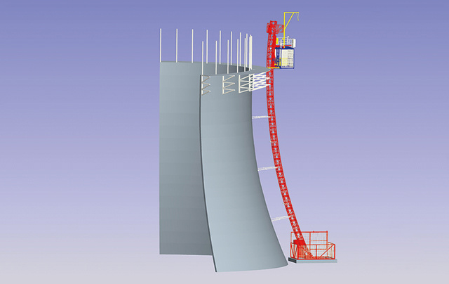 該機(jī)是冷卻塔施工的專用設(shè)備,與升降機(jī)配合使用,頂部塔機(jī)可以吊運(yùn)鋼筋,塔身為升降機(jī)提供附著支撐,水平吊橋?yàn)槭┕と藛T和物料提供平臺(tái)。