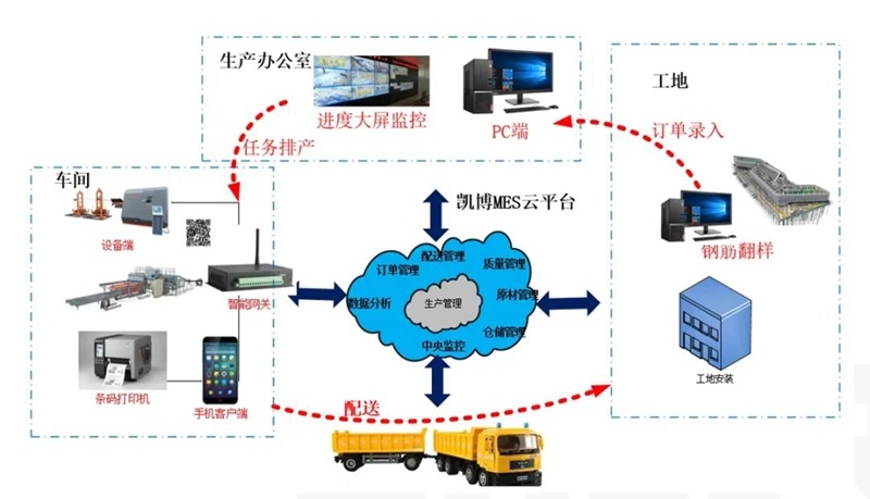 并且,凱博科技攜手中國鐵道科學(xué)研究院集團(tuán)有限公司,開發(fā)凱博鋼筋加工管理軟件系統(tǒng)和鋼筋加工遠(yuǎn)程控制系統(tǒng),打造智能控制中心。鋼筋加工管理軟件系統(tǒng)以鋼筋加工過程中物資流管理為核心,借助工業(yè)互聯(lián)網(wǎng)、云服務(wù)、智能設(shè)備等技術(shù)手段,實(shí)現(xiàn)多項(xiàng)目多任務(wù)遠(yuǎn)程訂單管理,實(shí)現(xiàn)訂單排產(chǎn)、生產(chǎn)訂單分發(fā)、生產(chǎn)標(biāo)牌打印、成品完成報(bào)工,成品出入庫等功能,同時(shí)能夠以電子大屏實(shí)現(xiàn)項(xiàng)目訂單動態(tài)實(shí)時(shí)監(jiān)控、加工廠整體運(yùn)營狀態(tài)的中心化顯示。鋼筋加工遠(yuǎn)程控制系統(tǒng),可實(shí)時(shí)顯示加工場各種設(shè)備生產(chǎn)狀態(tài),同時(shí)實(shí)現(xiàn)中控室對現(xiàn)場設(shè)備啟動和停止的遠(yuǎn)程控制,造就了高鐵梁場鋼筋加工數(shù)字化新模式!