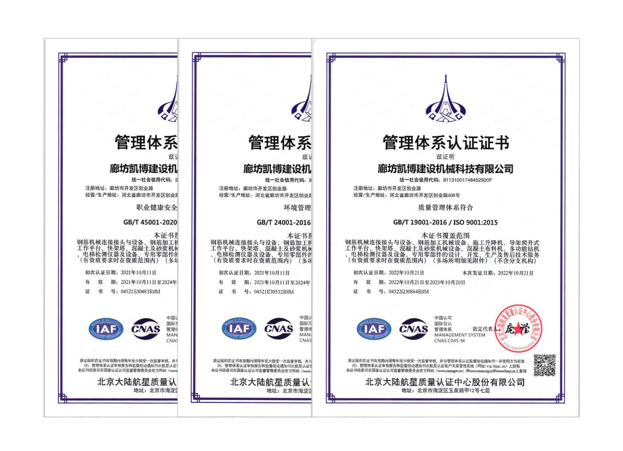 2022年9月26日至30日,北京大陸航星質(zhì)量認證中心股份有限公司對廊坊凱博建設(shè)機械科技有限公司開展了為期5天的質(zhì)量、環(huán)境、職業(yè)健康安全管理體系外審工作,在公司領(lǐng)導(dǎo)的高度重視和各職能部門的積極配合下,外審工作順利完成。