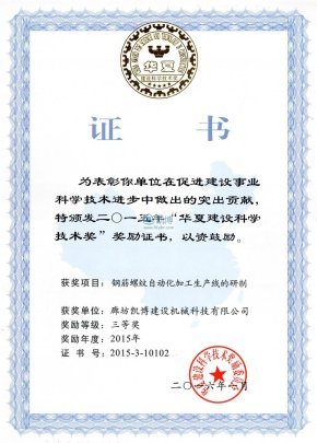 機(jī)械工業(yè)科學(xué)技術(shù)獎(jiǎng)三等獎(jiǎng)智能化鋼筋 部品生產(chǎn)成套設(shè)備研究與產(chǎn)業(yè)化開(kāi)發(fā)