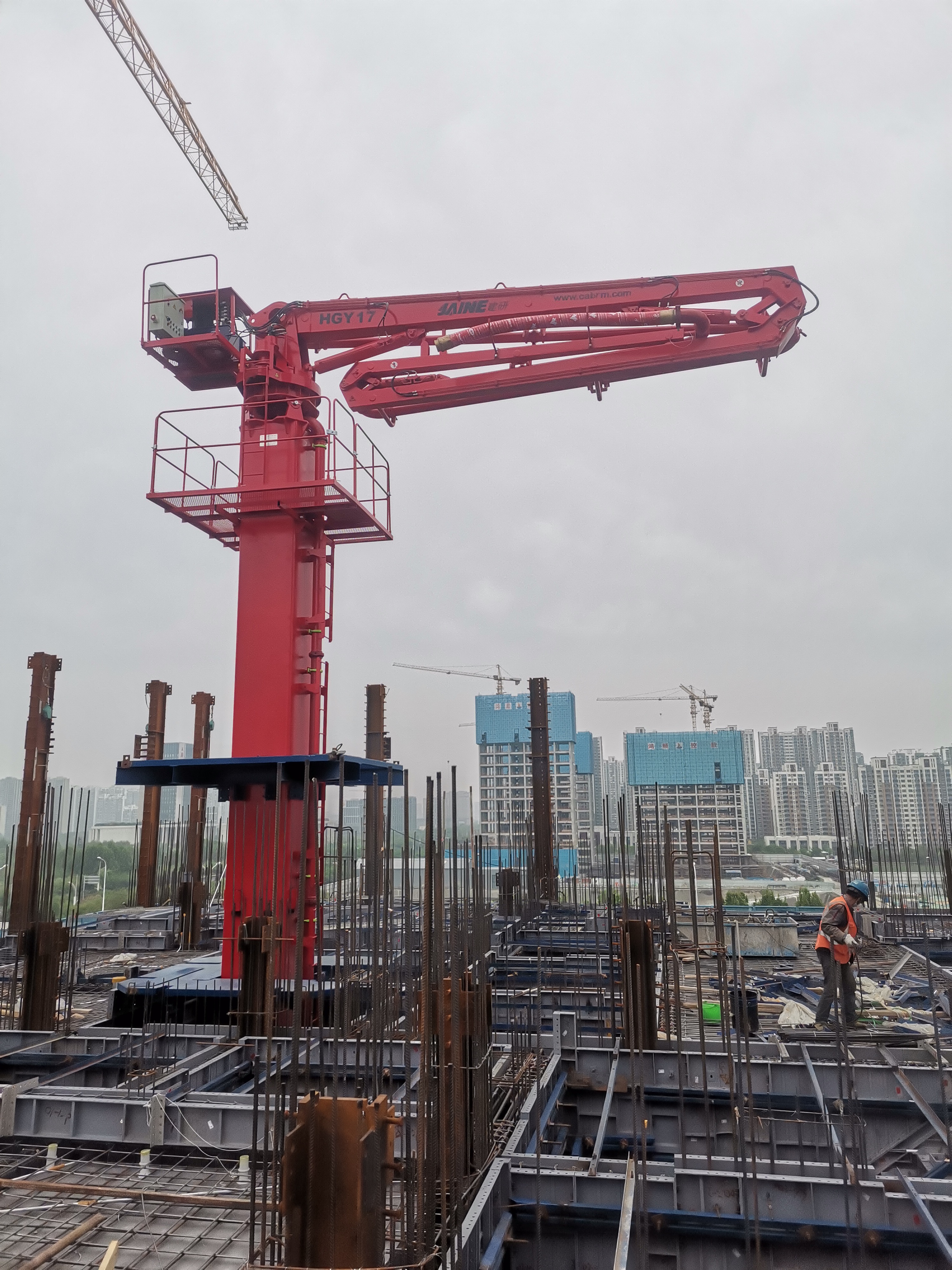 JAINE建研?內(nèi)爬式布料機(jī)適用于高層建筑施工,塔身固定在電梯井或者樓板預(yù)留孔內(nèi),可利用爬升框架和液壓油缸的頂升動作在樓層間爬升,使布料機(jī)隨著施工層面的升高而升高。