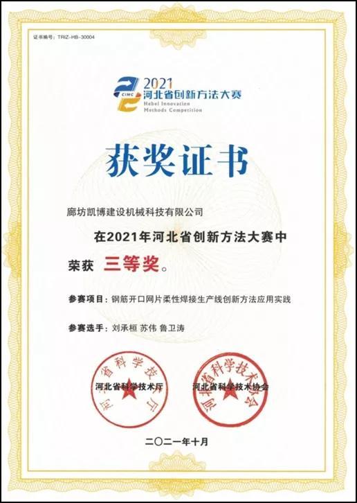 廊坊凱博建設(shè)機械科技有限公司(以下簡稱“凱博科技”)完成的“鋼筋開口網(wǎng)片柔性焊接生產(chǎn)線創(chuàng)新方法應(yīng)用實踐”項目在2021年河北省創(chuàng)新方法大賽中榮獲三等獎。此次參賽是凱博科技創(chuàng)新團(tuán)隊第二次參加河北省創(chuàng)新方法大賽,2019年凱博科技“教學(xué)型塔式起重機”項目曾獲“2019河北省創(chuàng)新方法大賽三等獎”。
